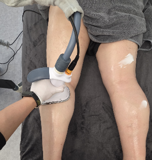 첨부된 세 번째 사진은 꽉 막힌 종아리의 하수구를 뚫어내기 위해 '심부 에너지 테라피'를 적용하는 모습입니다.