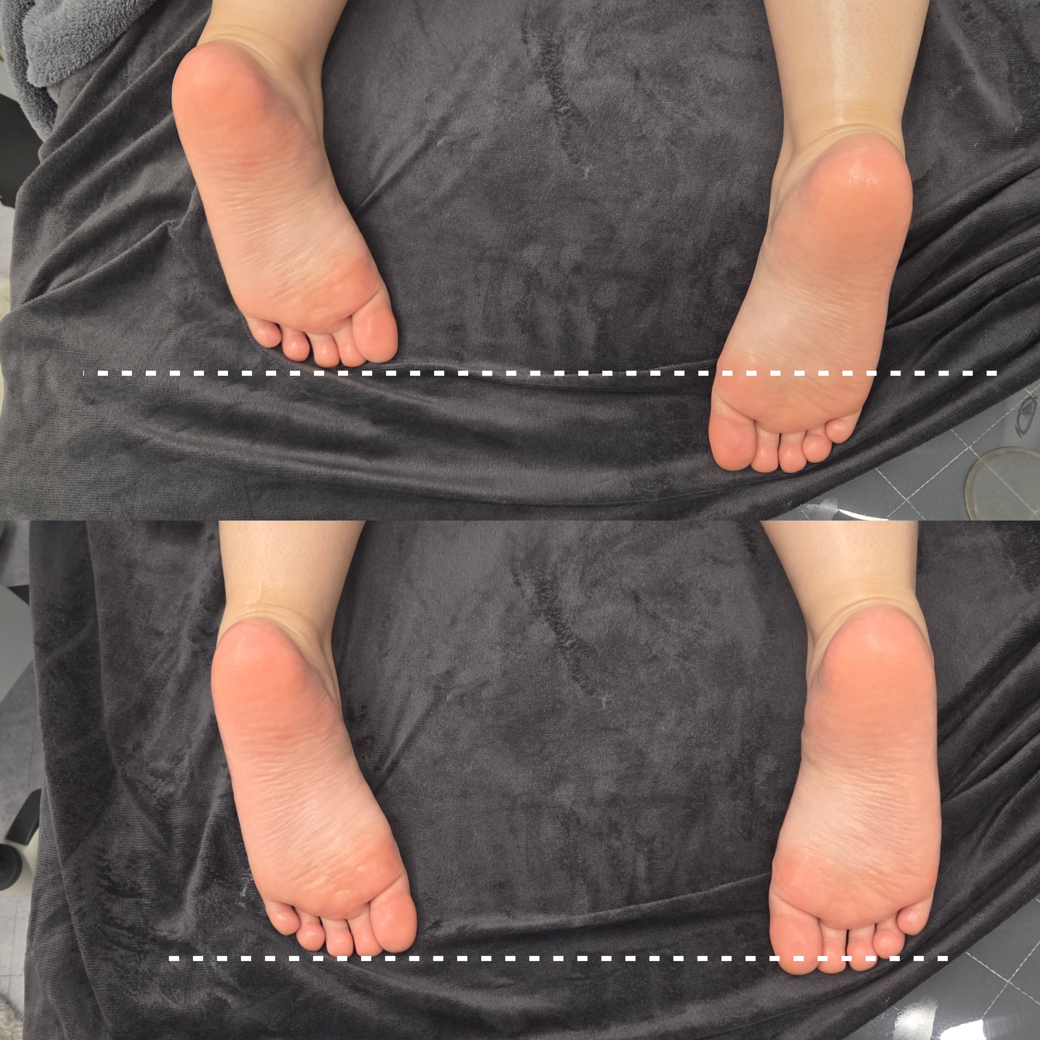 관리 전의 모습을 보면 발목이 바깥쪽으로 휘어지며 아킬레스건의 정렬이 심하게 무너져 있고, 왼쪽 다리가 위로 쑥 딸려 올라간 확연한 '짝짝이 다리' 상태입니다.